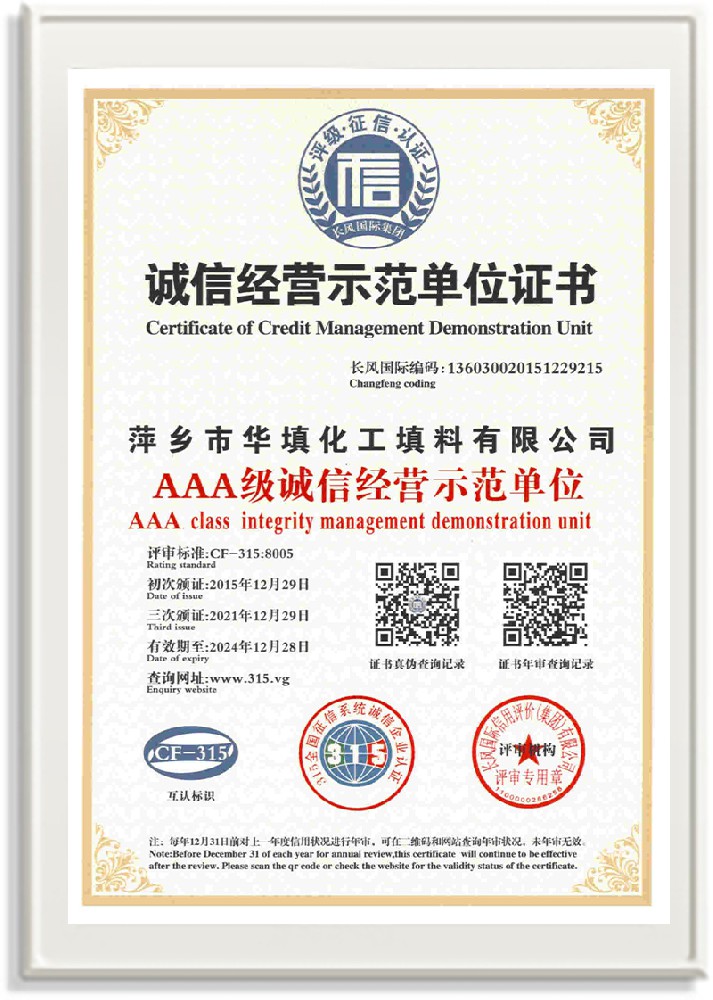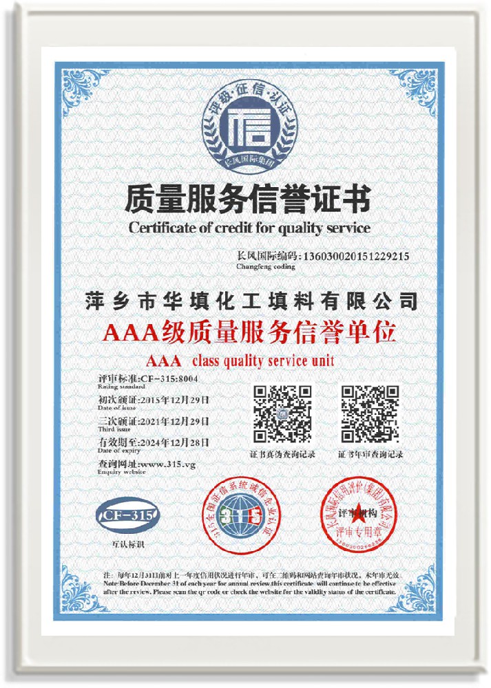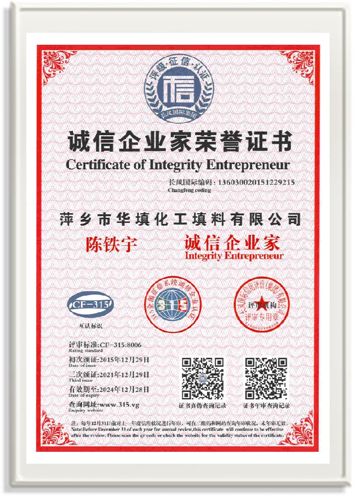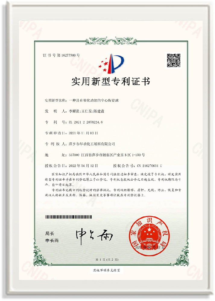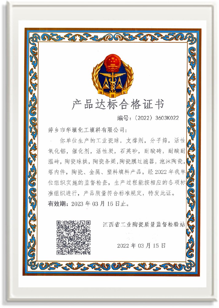 萍鄉(xiāng)市華填化工填料有限公司,位于320國道、109國道、浙贛鐵路、昌金高速公路貫穿其中,交通便利,是江西西部一顆燦爛明珠,創(chuàng)建于20世紀70年代初期,是中國石油天然氣股份有限公司“能源一號網(wǎng)”會員企業(yè)、中國石化物資采購電子商務(wù)網(wǎng)絡(luò)和中國海洋石油總公司采辦業(yè)務(wù)系統(tǒng)成員單位,是上海大學江西材料基因組工程產(chǎn)業(yè)研究院工業(yè)陶瓷產(chǎn)業(yè)創(chuàng)新聯(lián)盟基地,且通過ISO9001:2015質(zhì)量管理體系、ISO14001:2015環(huán)境管理體系、ISO45001:2018職業(yè)健康安全管理體系認證的化工填料生產(chǎn)企業(yè)。公司擁有陶瓷、塑料、金屬填料、催化劑、活性氧化鋁、分子篩等產(chǎn)品生產(chǎn)線,現(xiàn)有固定資產(chǎn)3616萬元,占地面積3.8萬平方米。公司具有悠久的生產(chǎn)歷史、雄厚的技術(shù)力量和先進的生產(chǎn)工藝設(shè)備,可生產(chǎn)工業(yè)瓷球(支撐劑)、陶瓷、金屬、塑料質(zhì)的規(guī)整、散堆化工填料及分子篩、催化劑、生化濾料、活性氧化鋁、石化助劑、活性炭、環(huán)保材料、耐火材料等系列的200多種規(guī)格型號產(chǎn)品。